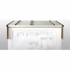Provides compact drop-lift storage for 12 clamps and Includes a dozen 36″ aluminum print clamps. Clamps lift out and drop in for easy access. Extends 15″ from the wall – ideal where space is limited. Maximum capacity 1200 sheets. Finished in a durable sand beige powder coat finish.