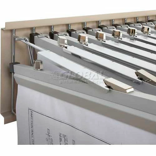 Mounts directly to the wall for space saving storage. Stud spaced mounting holes permit secure fastening to the wall. Rack Includes a dozen chrome plated pivot hangers that swing wide for easy access making it simple to locate and remove a file. Includes a dozen 18″ aluminum print clamps. Maximum capacity is 1200 sheets. Finished in a durable sand beige powder coat finish.