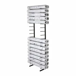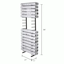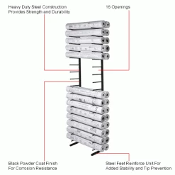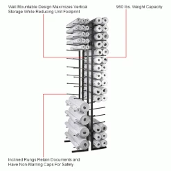 Vis-i-Rackβ’ high capacity blueprint storage racks provide a wall mountable solution for vertical storage of blueprints and other documents. Great for blueprints, artwork, maps, poster, documents and other large rolled file materials. These wall mount racks use up limited floor space to provide optimal vertical storage. Made using heavy duty steel frame with welded posts to support 960 lb. total capacity. 9″L rungs include non-marring caps for safety. Rungs are welded and at incline to retain files and documents. Steel feet for stability. Wall brackets are spaced 16″ for installation on walls. Black powder coat finish. Rack with 16 Openings includes sixteen 5″H openings.