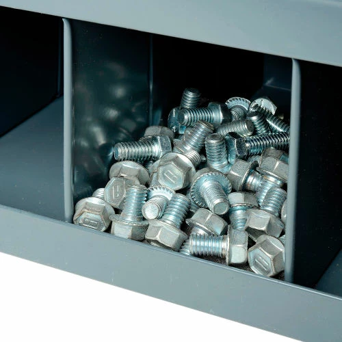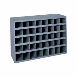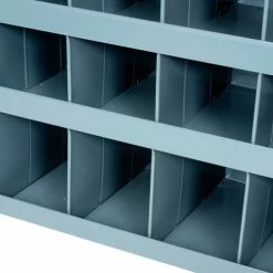 This bin features an all welded, prime cold rolled steel construction and the bin is painted in a durable gray powder coat finish. The 1-1/8″ bin fronts are fully hemmed to display labels and retain parts, the sides are roll-formed for increased strength and stability, the dividers are ribbed and hemmed for added strength. These bins are modular with most 9″ deep bins and drawer cabinets; mounting holes are located in both the top and bottom. This bin ships fully assembled and optional door, base, and bin labels are available.