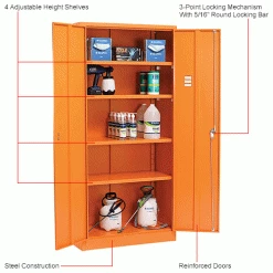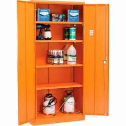 For securable and supreme level storage management at facilities, businesses and other commercial establishments, the Global IndustrialΒ Emergency Preparedness Cabinet is your solution for securely containing medical items, PPE and similar pandemic management supplies. This standalone, double door cabinet occupies minimal space, making it suitable for any hallway, warehouse room or commercial interior. Full body steel construction assures impact resistance to maintain a smooth and industrially resilient quality. Easy to assemble. Bright orange color finish provides high visibility. 1 Year Limited Warranty.