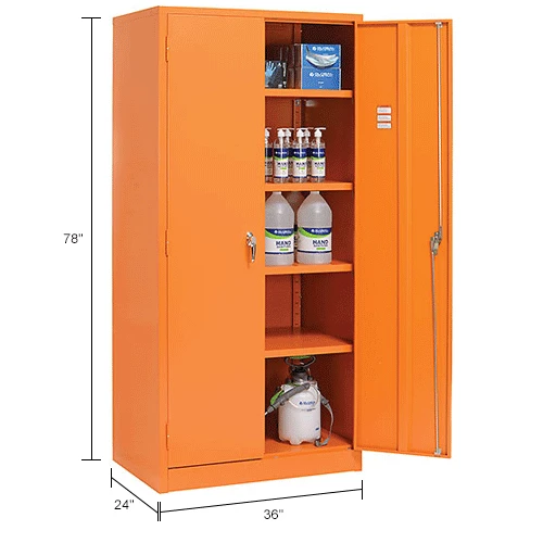 For securable and supreme level storage management at facilities, businesses and other commercial establishments, the Global Industrialย Emergency Preparedness Cabinet is your solution for securely containing medical items, PPE and similar pandemic management supplies. This standalone, double door cabinet occupies minimal space, making it suitable for any hallway, warehouse room or commercial interior. Full body steel construction assures impact resistance to maintain a smooth and industrially resilient quality. Bright orange color finish provides high visibility. 1 Year Limited Warranty.