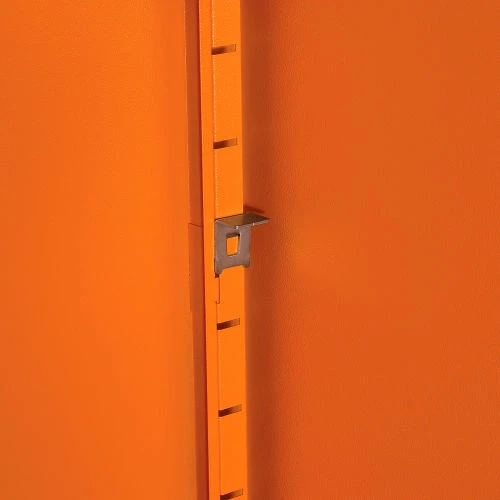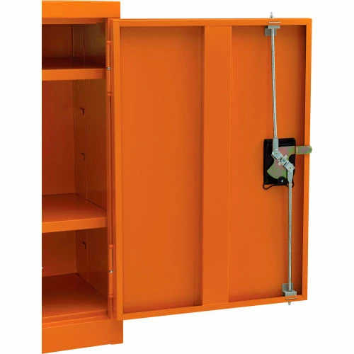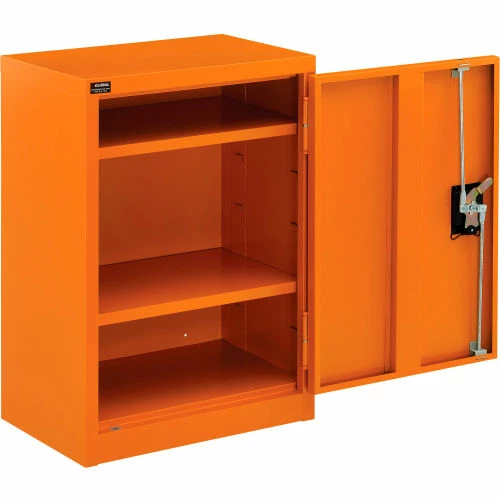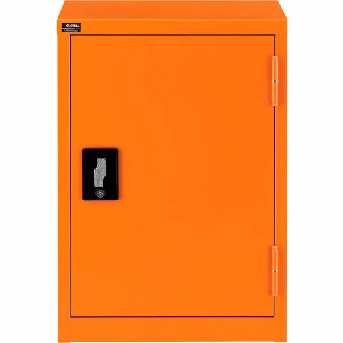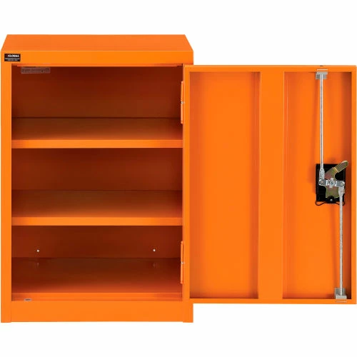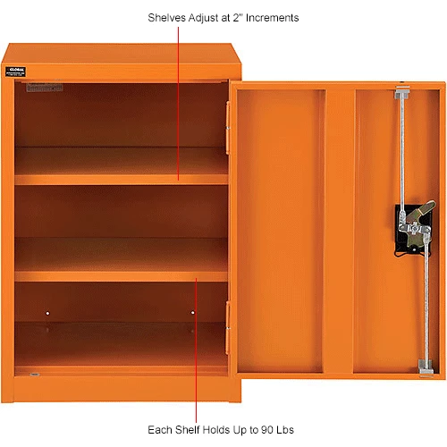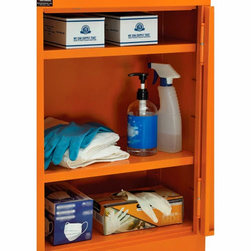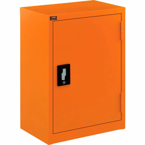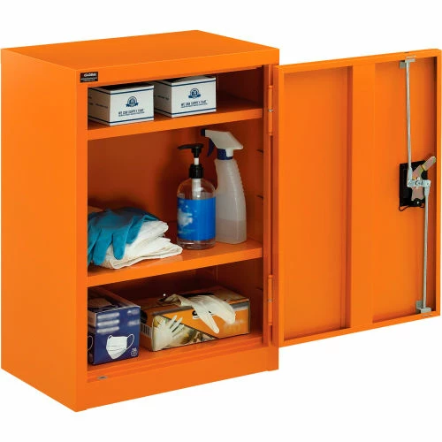 For securable and supreme level storage management at facilities, businesses, and other commercial establishments, the Global Industrialย Emergency Preparedness Counter Height Cabinet is your solution for safely containing medical items, PPE and similar pandemic management supplies. This wall mountable storage occupies minimal space, making it suitable for any hallway, warehouse room or commercial interior. Full body steel construction assures impact resistance to maintain a smooth and industrially resilient quality. Adjustable shelving allows custom organization preferences to fit a variety of different sized items. This cabinet is keyed alike for convenient and secure accessibility. Bright orange color finish provides high visibility. 1 Year Limited Warranty.