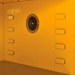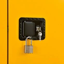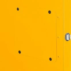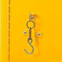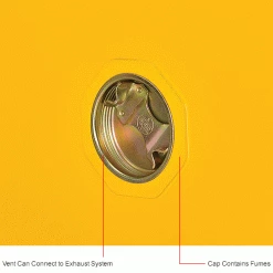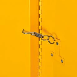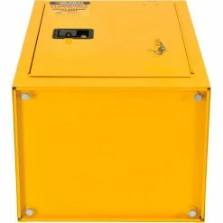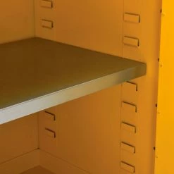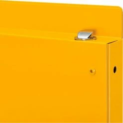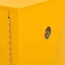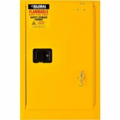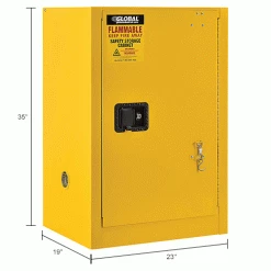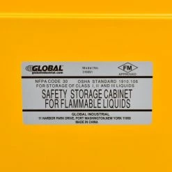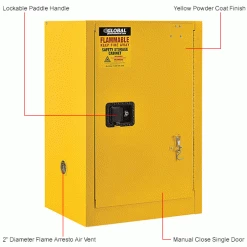 Protect sensitive liquid materials in your workplace that can’t sit on an open shelf or countertop. The Global Industrial Flammable Cabinet keeps contents in a secure, steel-welded storage unit. Its door swings on a piano hinge, making it ideal for storage units that will be opened and closed frequently. Security features include a lockable paddle handle, a self-closing door, a compatible vent that connects to an exterior exhaust system, and a cap that helps contain fumes inside the unit. The single height adjustable shelf can be moved in order to accept larger contents, and adjustable leveling feet at the bottom of the unit help accommodate a variety of indoor floor surfaces.
