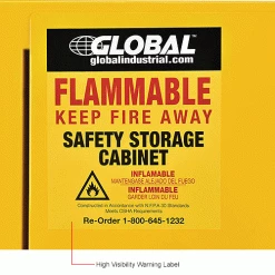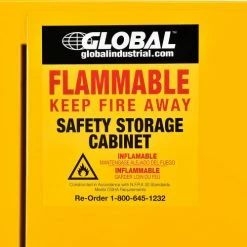 For securable and supreme level flammable storage management at facilities, businesses, and other commercial establishments, the Global Industrialย Flammable Storage Cabinet is your solution for securely containing sensitive items and similar supplies in need of flame protection. This standalone, single door cabinet is compact in design to occupy minimal space, making it suitable for any hallway, warehouse room or commercial interior. Built to withstand a storage capacity of 16 gallons. Cabinet door closes automatically for added security and convenience. Rigid heavy duty construction is cost effective and assures lasting durability. Fully assembled and solidly built. Bright yellow color finish with Flammable – Keep Fire Away label. 1 Year Limited Warranty.