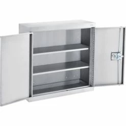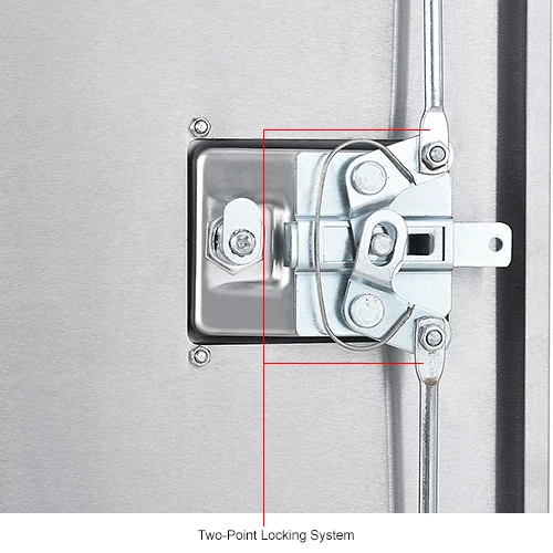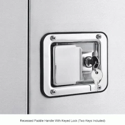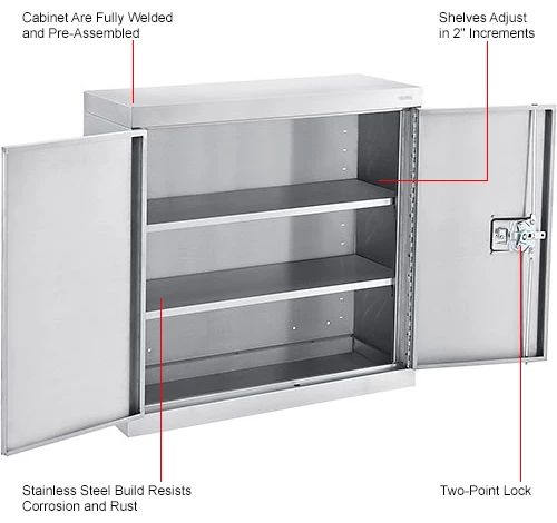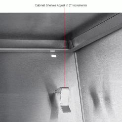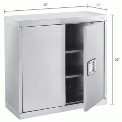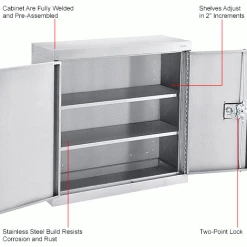 Constructed of 18-gauge, type 304 stainless steel with superior resistance to acid, corrosion and rust. This fully welded cabinet is ideal for restaurants, washdown and cleanroom environments. Shelves adjust on 2″ increments with a shelf capacity of 150 lbs. Cabinet features a stainless steel recessed paddle handle. Versatile to allow for wall-mounting.