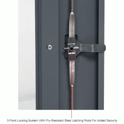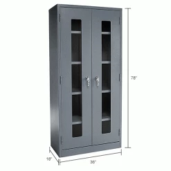 The best value on the market, these storage cabinets feature rugged door construction where it matters most Doors have 3 extra large 4″ x 3/8″ barrel hinges each for security, channel reinforced impact resistant acrylic windows (window dimensions 5.5″x61″), 3-point locking system with pry-resistant solid steel 5/16″ latching rods, and dual chrome plated die-cast key locking handles. Box-formed shelves have full width steel channel reinforcement to help prevent shelf deflection. Holds 300 lbs. per shelf and meets ANSI/ BIFMA shelf capacity standards. Easy assembly.