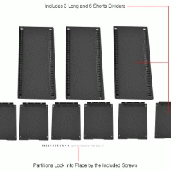 Metal Divider Kit for Paramountβ’ Modular Cabinets includes 3 long partitions and 6 short dividers. Partitions divide drawers into rows, and Dividers define compartments within the rows. Partitions and Dividers are adjustable to allow flexibility of drawer subdividing for the highest density storage. Partitions can be locked into place by the included screws. Partitions install (6-1/2″) apart. Black color.