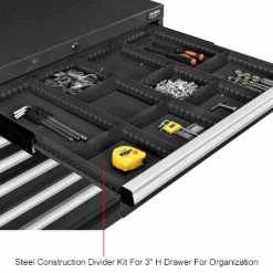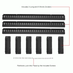 Metal Divider Kit for Paramountβ’ Modular Cabinets includes 3 long partitions and 6 short dividers. Partitions divide drawers into rows, and Dividers define compartments within the rows. Partitions and Dividers are adjustable to allow flexibility of drawer subdividing for the highest density storage. Partitions can be locked into place by the included screws. Partitions install (6-1/2″) apart. Black color.