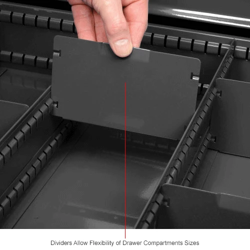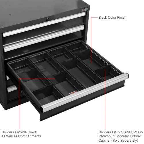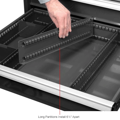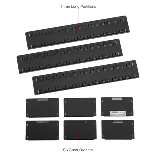 Metal Divider Kit for Globalโข Modular Cabinets includes 3 long partitions and 6 short dividers. Partitions divide drawers into rows, and Dividers define compartments within the rows. Partitions and Dividers are adjustable to allow flexibility of drawer subdividing for the highest density storage. Partitions can be locked into place by the included screws. Partitions install (6-1/2″) apart. Black color.