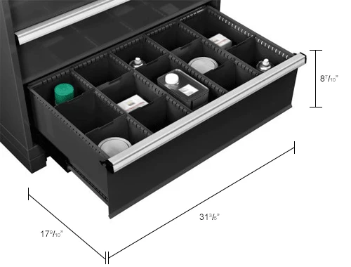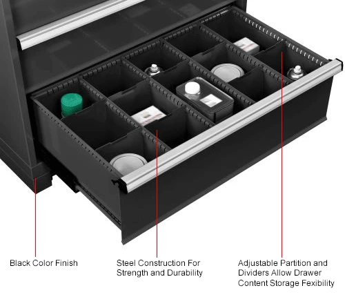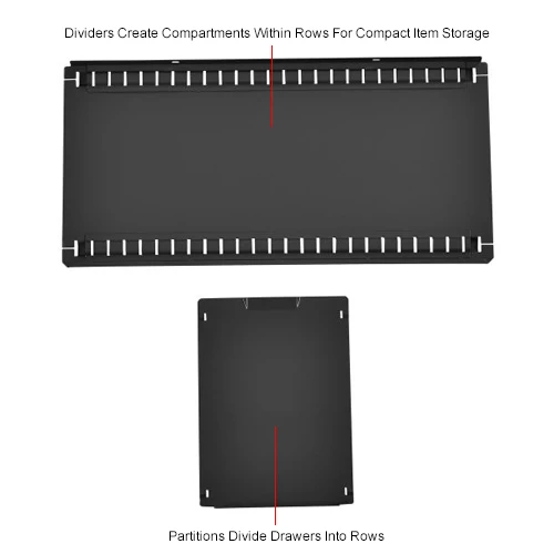 Metal Divider Kit for Globalβ’ Modular Cabinets, 36″W x 24″D, includes 4 long partitions and 6 short dividers. Partitions divide drawers into rows, and Dividers define compartments within the rows. Partitions and dividers are adjustable to allow flexibility of drawer subdividing for the highest density storage. Partitions can be locked into place by the included screws. Partitions install (6-1/2″) apart. Black color.