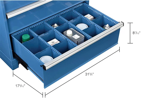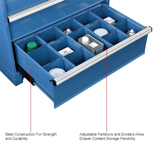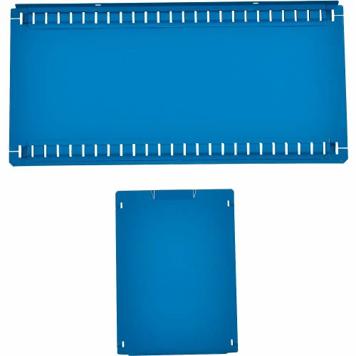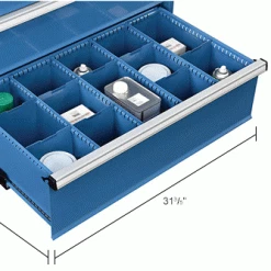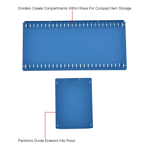 Metal Divider Kit for Globalβ’ Modular Cabinets, 36″W x 24″D, includes 4 long partitions and 6 short dividers. Partitions divide drawers into rows, and Dividers define compartments within the rows. Partitions and dividers are adjustable to allow flexibility of drawer subdividing for the highest density storage. Partitions can be locked into place by the included screws. Partitions install (6-1/2″) apart. Blue color.