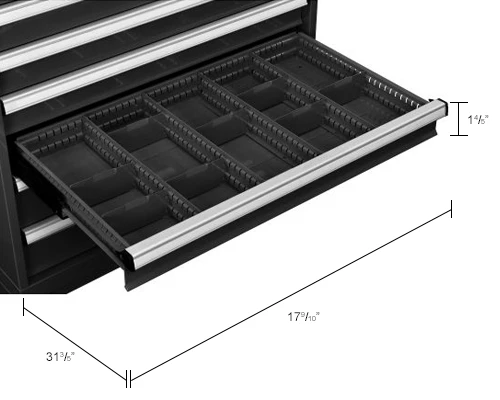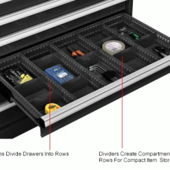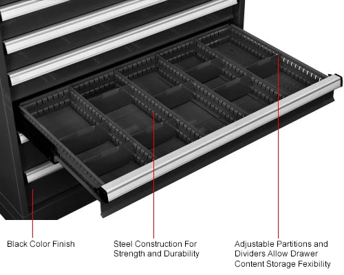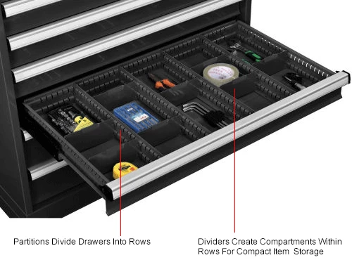 Metal Divider Kit for Globalβ’ Modular Cabinets, 36″W x 24″D, includes 4 long partitions and 6 short dividers. Partitions divide drawers into rows, and Dividers define compartments within the rows. Partitions and dividers are adjustable to allow flexibility of drawer subdividing for the highest density storage. Partitions can be locked into place by the included screws. Partitions install (6-1/2″) apart. Black color.