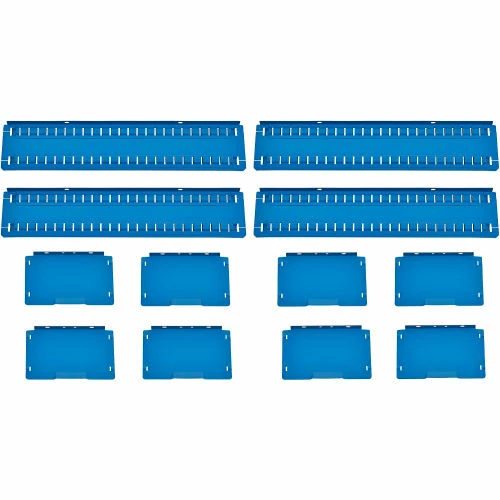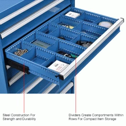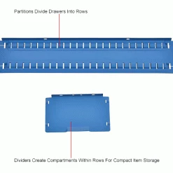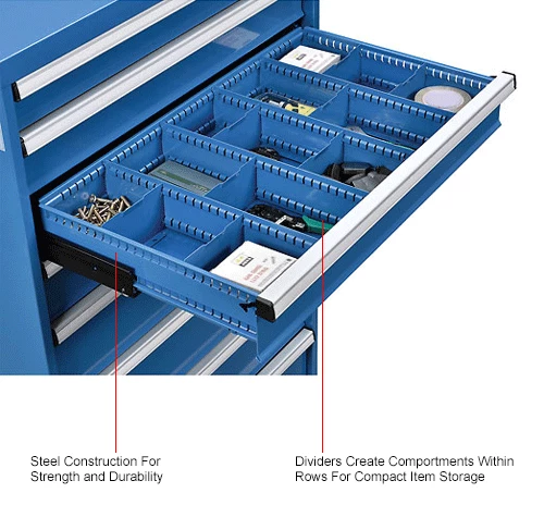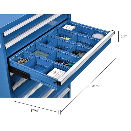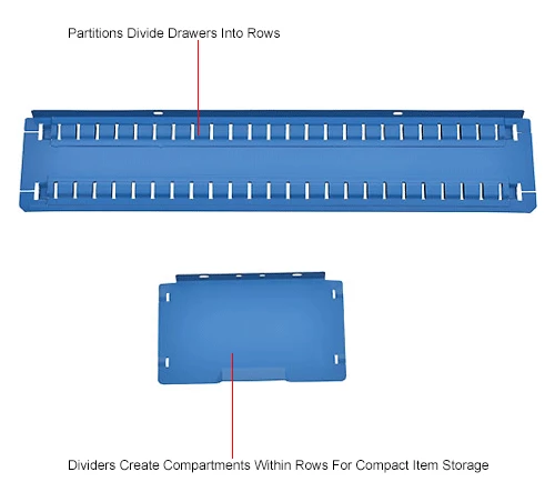Metal Divider Kit for Globalβ’ Modular Cabinets, 36″W x 24″D, includes 4 long partitions and 6 short dividers. Partitions divide drawers into rows, and Dividers define compartments within the rows. Partitions and dividers are adjustable to allow flexibility of drawer subdividing for the highest density storage. Partitions can be locked into place by the included screws. Partitions install (6-1/2″) apart. Blue color.