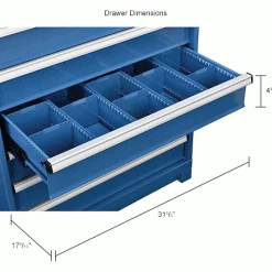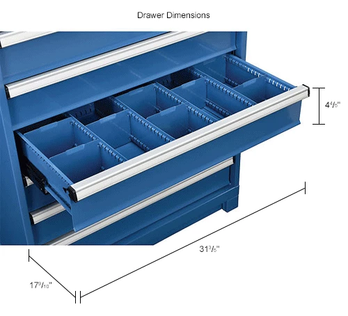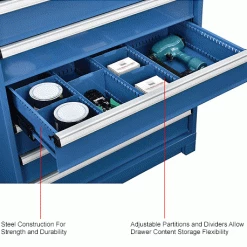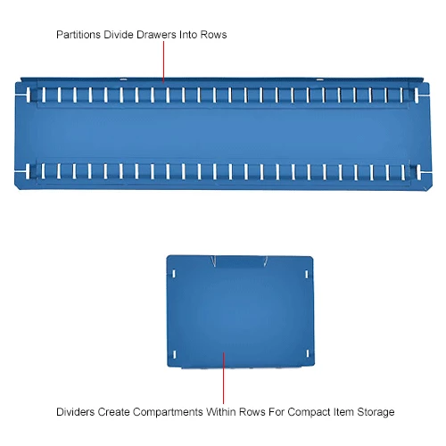 Metal Divider Kit for Globalβ’ Modular Cabinets, 36″W x 24″D, includes 4 long partitions and 6 short dividers. Partitions divide drawers into rows, and Dividers define compartments within the rows. Partitions and dividers are adjustable to allow flexibility of drawer subdividing for the highest density storage. Partitions can be locked into place by the included screws. Partitions install (6-1/2″) apart. Blue color.