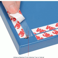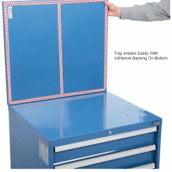 Top Tray features blue finish to match with cabinet. Raised edges keep contents contained. 1/16″ thick black ribbed vinyl mat provides a non-skid surface. Installs easily with adhesive backing on underside of the tray.