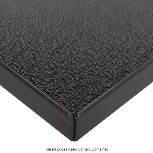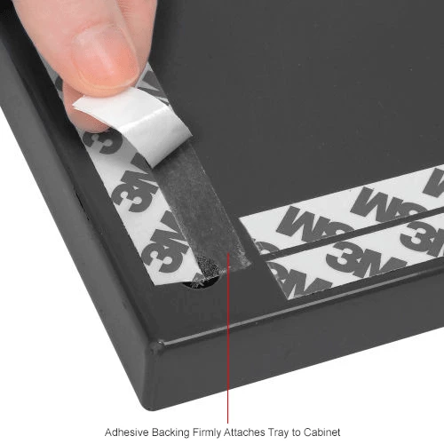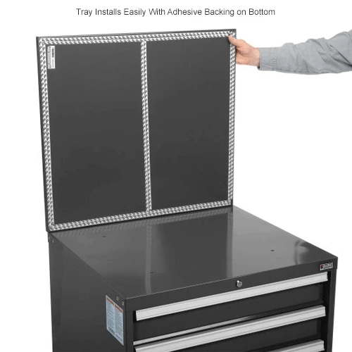 Top Tray features Black finish to match with cabinet. Raised edges keep contents contained. 1/16″ thick black ribbed vinyl mat provides a non-skid surface. Installs easily with adhesive backing on underside of the tray.