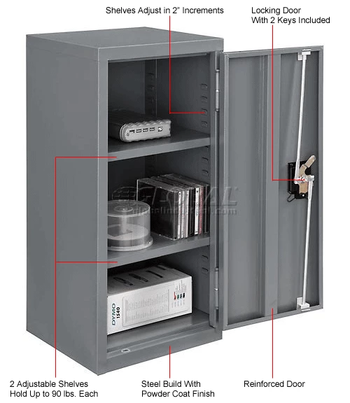 Contemporary style and durable steel construction withstand heavy warehouse use, these cabinets fill a variety of needs at an excellent price. Ideal for storage of tools, aerosol cans, first aids and more. Recessed handles with 2 keyed alike keys for safety and security. Wall Mount Cabinets feature two 22 gauge steel shelves that are height adjustable at 2″ increments. Inside Dimensions 13.5″W x 11.75″D x 28″H. Opening Dimensions 11.5″ x 26.5″. Durable powder coat finish.