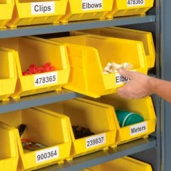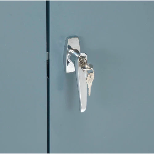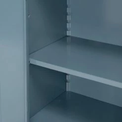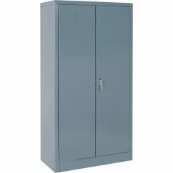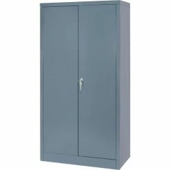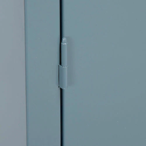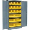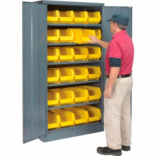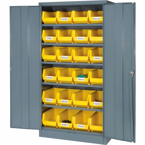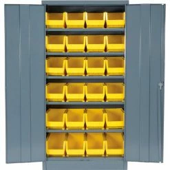 Storage cabinet features reinforced doors that open a full 180ยฐ for complete access and close with a three-point locking system and key lock. Break resistant polypropylene plastic bins have generous hopper openings offer easy viewing and access. Bins fit efficiently on heavy-gauge steel adjustable shelves. Powder coat exterior finish. Assembled cabinets are not returnable.Cabinet measures 36″W x 18″D x 72″H. Image shows the 48″W x 24″D x 78″H cabinet with 20 bins.