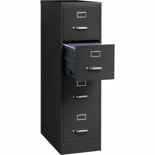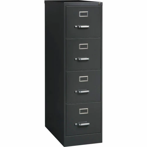 26-1/2-inch deep four-drawer, letter width, commercial grade vertical file cabinets are perfect for business, educational, or personal offices. These cabinets feature a classic design and are constructed with high quality durable materials that are suitable for heavy-duty use. Ships fully assembled and is ready to accept letter width hanging file folders. Each drawer includes full extension ball-bearing slides for smooth drawer action. Even fully loaded, these drawers open with ease. Adjustable follower wires keep files upright. The aluminum handles and label holder are durable and functional making it easy to access and label drawer contents. The included core-removable lock allows cabinets to be keyed alike. Designed to meet or exceed ANSI/BIFMA industry standards for performance and workmanship. Made with 28% total recycled content. Backed by a Limited Lifetime Warranty. TAA Compliant. Greenguard Gold certified for indoor air quality.