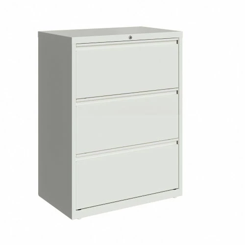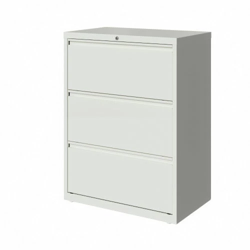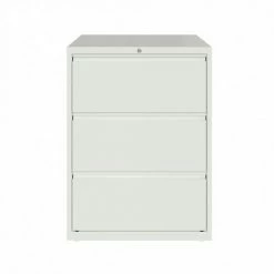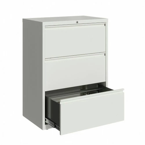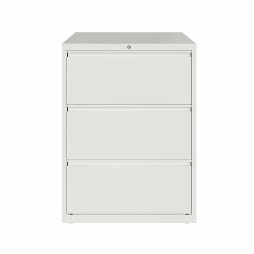 This 30 in. wide 3 drawer commercial grade lateral filing cabinet is designed for heavy duty use, yet looks great in any office. Precision ball-bearing suspension allows for quiet use in your busy office environment. Fully welded steel construction with reinforced base. Interlock system prevents tipping by only allowing one drawer open at a time. Dual lock bars and core-removable lock come standard. Unit includes hang rails, magnetic label holders, and four adjustable leveling glides. Greenguard Gold certified for indoor air quality. Meets or exceeds ANSI/BIFMA standards. TAA compliant. Limited Lifetime Warranty.