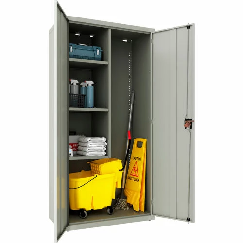 Steel janitorial storage cabinets provide a concealed storage solution that is useful in various markets including business, industrial, education, hospitality and healthcare. Janitorial cabinets are a space-efficient, flexible storage solution. This cabinet has durable, fully welded steel construction. With three half width adjustable shelves, and full full height storage for brooms, mops and other longer items this cabinet provides flexible storage that will help keep your essential materials organized. Recessed handle with core-removable lock provides a three point locking system that locks the top, bottom, and doors to keep your items secure. Shelves are adjustable in 1″ increments with 90lbs capacity per shelf. Limited lifetime warranty. Unit meets or exceeds ANSI/BIFMA industry standards. Greenguard gold certified.