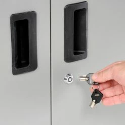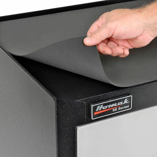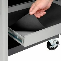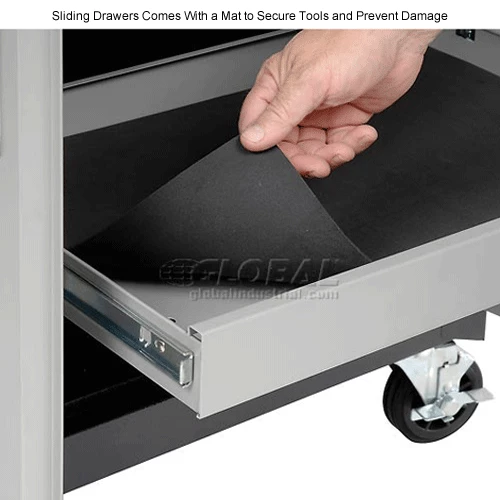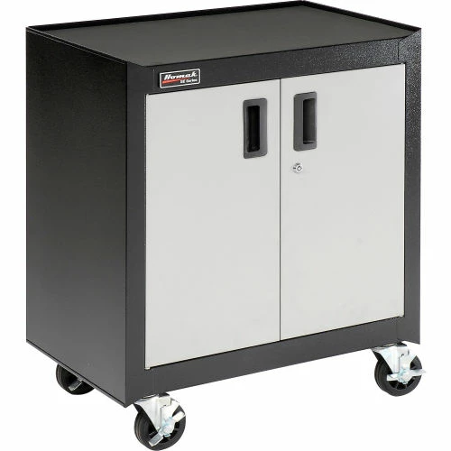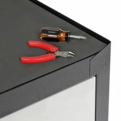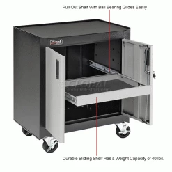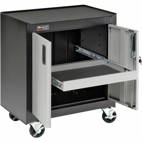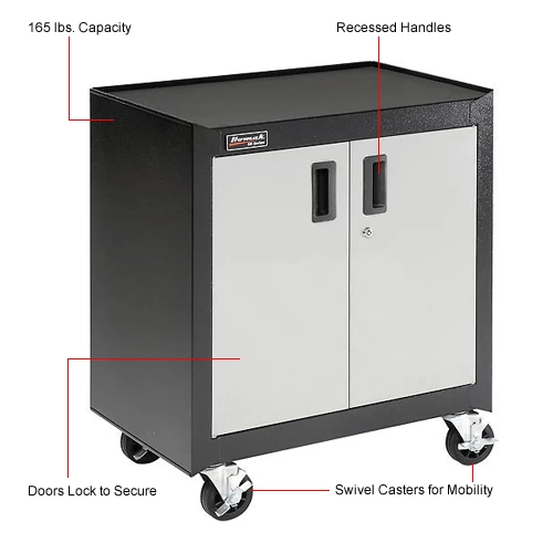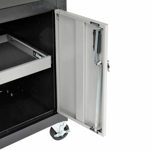 Configure the workstation that’s right for you with this multi-unit steel garage system. Durable garage furniture components are made using high quality steel with 2 mm thick body and 2.5 mm thick framing for strength. Cabinet doors and drawer fronts feature a sleek silver finish for enhanced appearance. Cabinet doors feature a cylinder lock for security and recessed handles for a catch-free surface. Body and frame have a black finish. Includes a pull-out shelf with ball bearing glides. Mobile Cabinets move easily on 4″ locking swivel casters. 3 Year Limited Warranty.