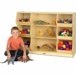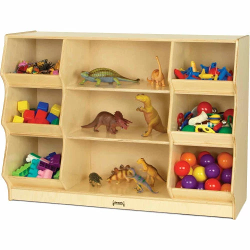 Six storage bins each with large opening and beveled lip to encourage ready access to toys and more. Three large center compartments provide additional storage. Great for block storage too