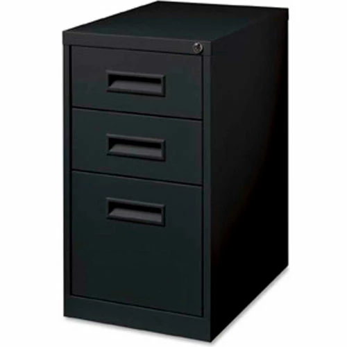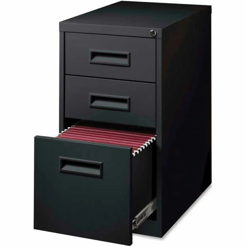 Mobile pedestal offers a box/box/file drawer configuration. Removable core lock secures all drawers. File drawer accommodates letter-size hanging folders with tabs. Each box drawer has a divider. Drawer slides have 90 percent extension. Pedestal is weighted to prevent tipping and made of steel with a powder-coat finish. Four casters make the pedestal mobile, and the two front casters lock for stability.