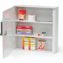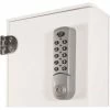 Master, sub-master and user code options offer flexibility in level of security. Keyless touch pad uses 4-digit code you program yourself. Electronic lock uses 1 AAA battery (included) and has a battery failure override. White ABS plastic cabinet impedes viewing of contents and is easily cleaned.