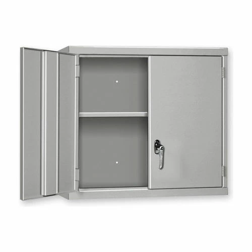 This Wall Cabinet is perfect to help organize your workspace. Features 18-gauge all welded steel construction. The cabinet can be mounted on a wall to save floor space. Flush mount double doors feature a 2-point locking handle. Includes one adjustable shelf.