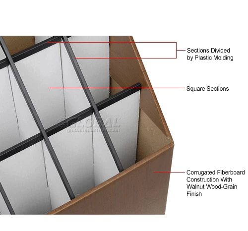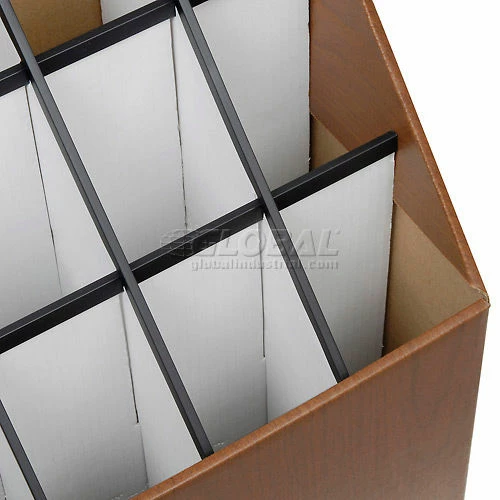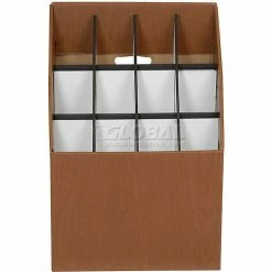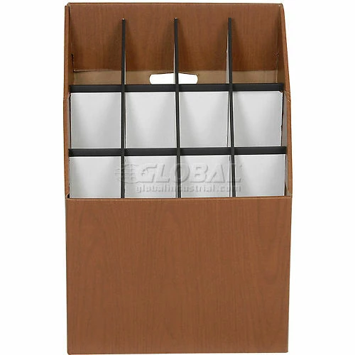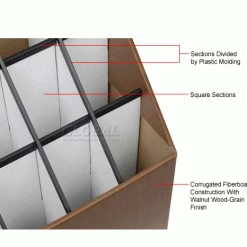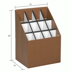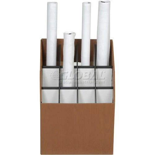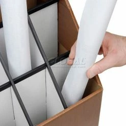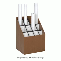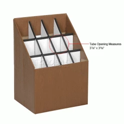Convenient roll files store and organize drawings, charts, plans, blueprints, maps, posters and other rolled materials. The grandstand design makes document retrieval easy. This model holds 12 tubes. Corrugated fiberboard construction has square sections divided by plastic molding and a walnut wood-grain finish. Measures 15″W x 12″D x 22″H overall. Tube size for this model measures 3-7/8″ x 3-5/8″. Lifetime Limited Warranty.