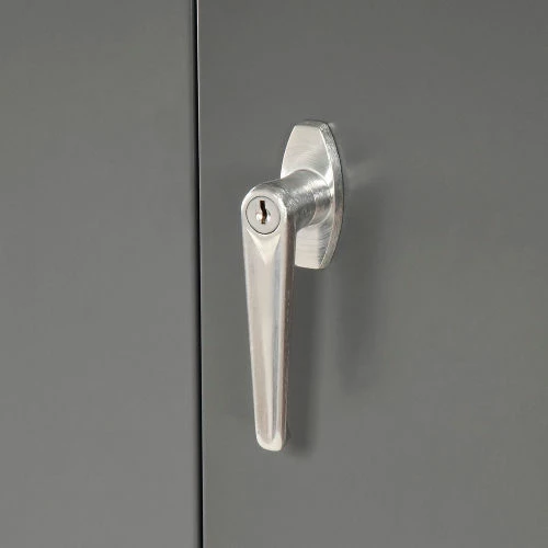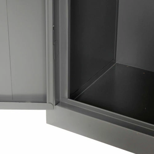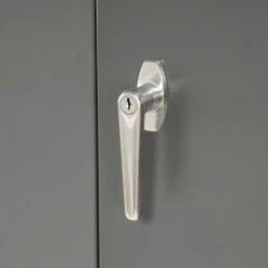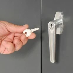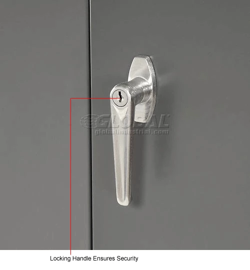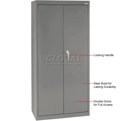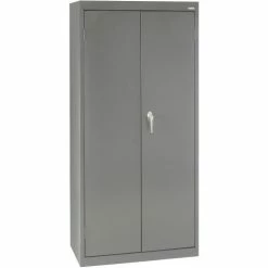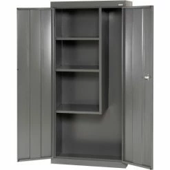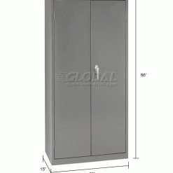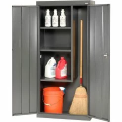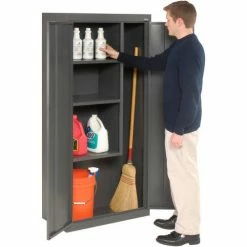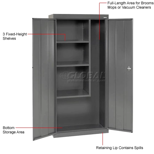 Organizes maintenance and cleaning supplies. Provides storage for brooms, mops, vacuum cleaners and more. Includes 3 fixed height shelves, shelf openings measure 18″W x 14″D x 12″H. Locking handle for safety and security. Box formed, channel reinforced doors for added strength. Retaining lip on bottom level contains spills. Shipped assembled.