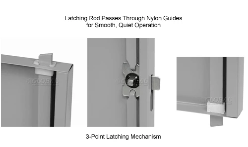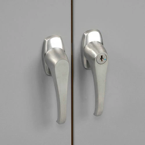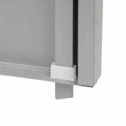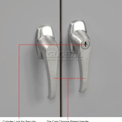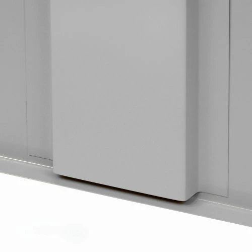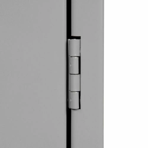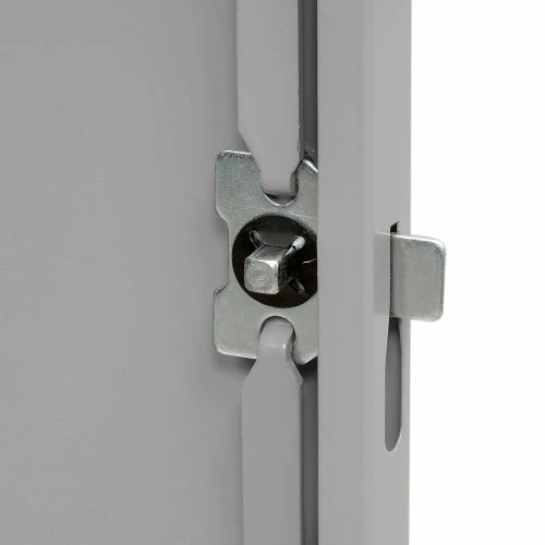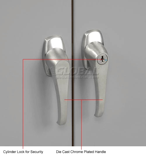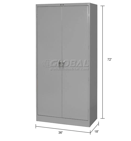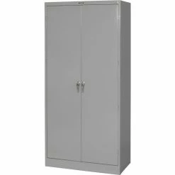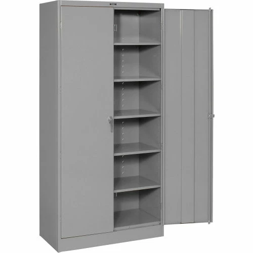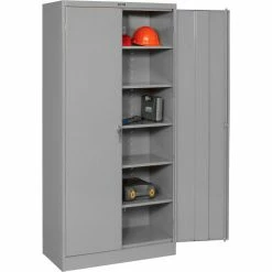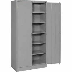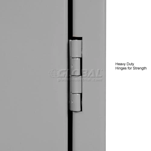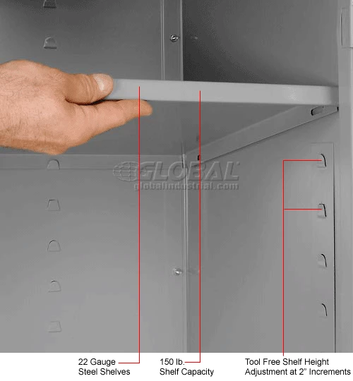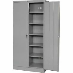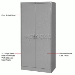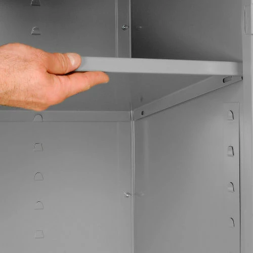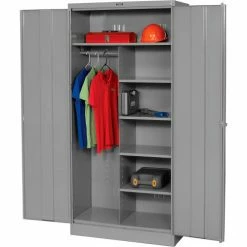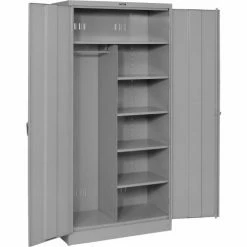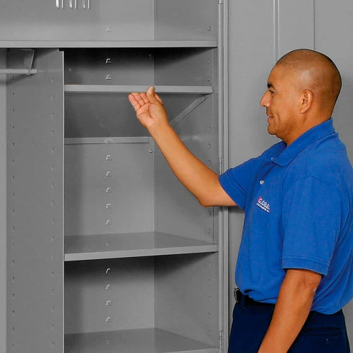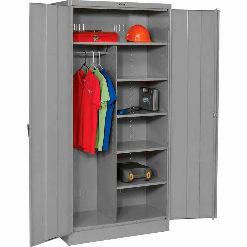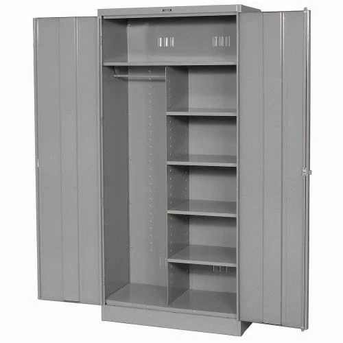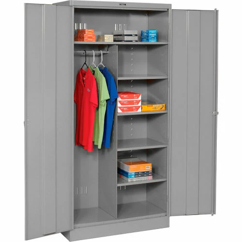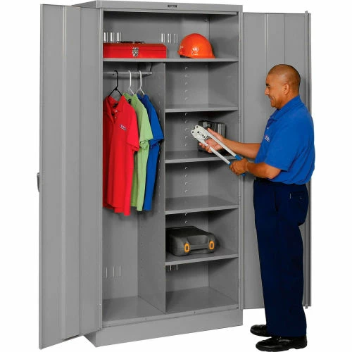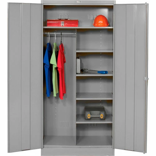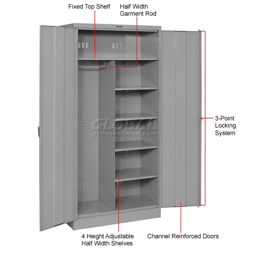 Clean, contemporary style and durable construction makes this steel storage cabinet perfect for office or warehouse environments. Made of durable cold rolled steel using 24 gauge steel body reinforced with a 22 gauge steel frame. Reinforced doors include 3-point locking system with die cast chrome plate locking handles for security. Locking flat bar rods include nylon guides for smooth door operation. 22 gauge steel shelves are height adjustable at 2 increments. 150 lb. shelf capacity. Combination Cabinet features one full width top shelf and 4 half shelves plus garment hanger bar for full length clothing storage. Durable powder coat finish. All Tennsco products are Proudly Made in the USA.