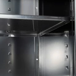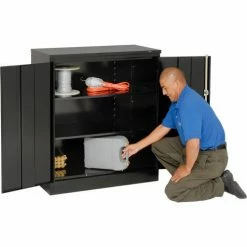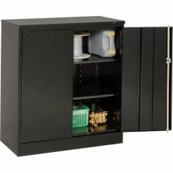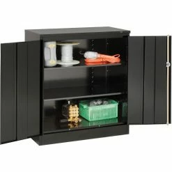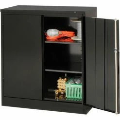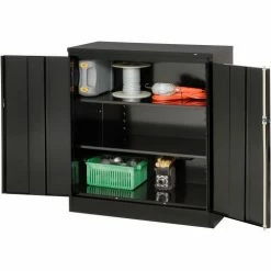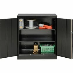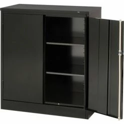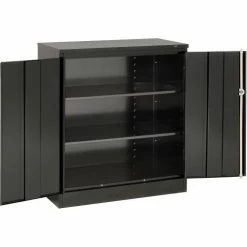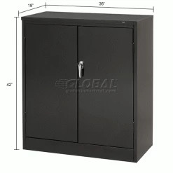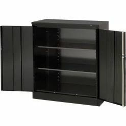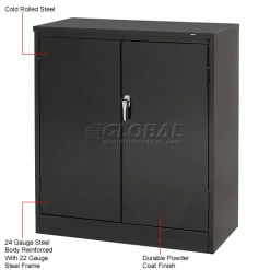 Clean, contemporary style and durable construction makes this steel storage cabinet perfect for office or warehouse environments. Made of durable cold rolled steel using 24 gauge steel body reinforced with a 22 gauge steel frame. Reinforced doors include 3-point locking system with die cast chrome plate locking handles for security. Locking flat bar rods include nylon guides for smooth door operation. 22 gauge steel shelves are height adjustable at 2 increments. 150 lb. shelf capacity. Durable powder coat finish. All Tennsco products are Proudly Made in the USA.