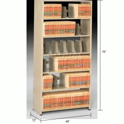 Imperial shelving offers a versatile storage solution designed for any office environment. Uniquely designed shelving saves up to 60% floor space compared to conventional filing equipment. Perfect for tab filing, making files more visible and accessible by keeping them upright and in order. Steel shelving is attractive and functional for the front office, as well as, rugged for the warehouse or storage room. Double walled T-post uprights feature welded steel panels, steel shoulder rivets and shelf supports to withstand up to 400 lb. shelf capacity. Steel shelves are height adjustable at 1-1/2″ increments. Includes five large 10-1/2″D x 7-1/2″H adjustable dividers per shelf that adjust along the backstop at 2″ increments to keep folders upright. Shelves include backstop to retain files. Includes non-marring molded polyethylene floor caps to protect floors and carpets. Sand enamel finish. Easy assembly.