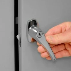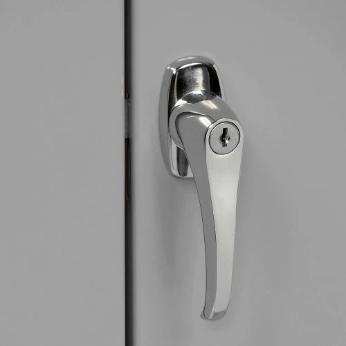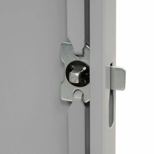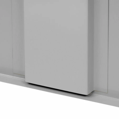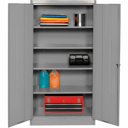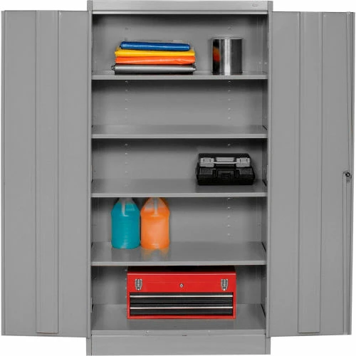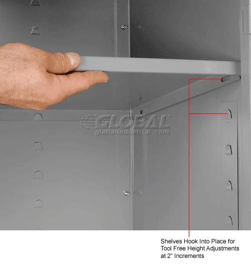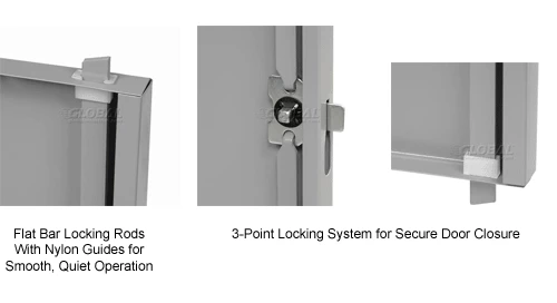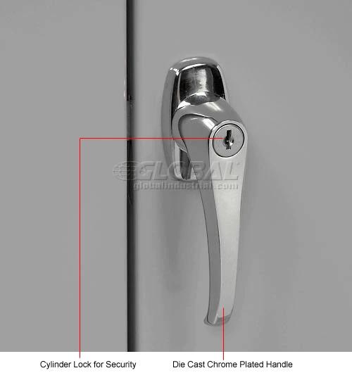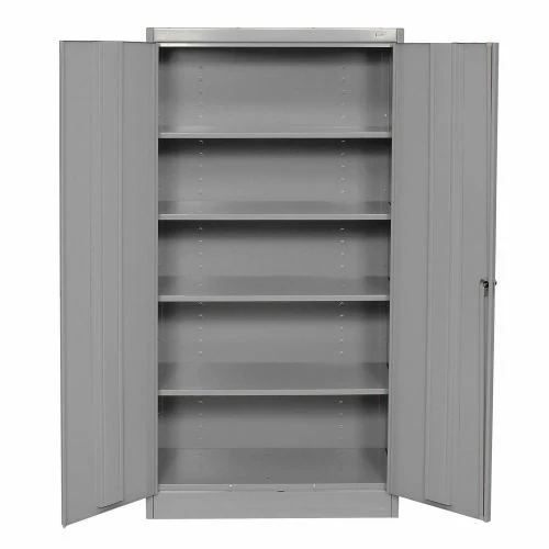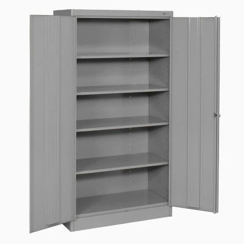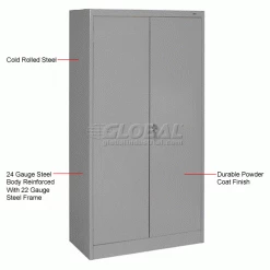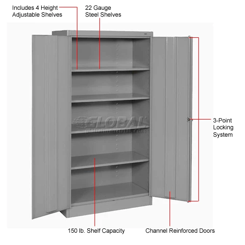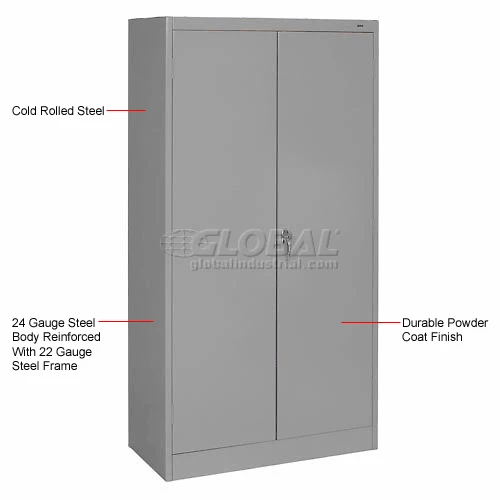 Clean, contemporary style and durable construction makes this steel storage cabinet perfect for office or warehouse environments. Made of durable cold rolled steel using 24 gauge steel body reinforced with a 22 gauge steel frame. Reinforced doors include 3-point locking system with die cast chrome plate locking handles for security. Locking flat bar rods include nylon guides for smooth door operation. 22 gauge steel shelves are height adjustable at 2 increments. 150 lb. shelf capacity. Durable powder coat finish. All Tennsco products are Proudly Made in the USA.