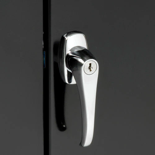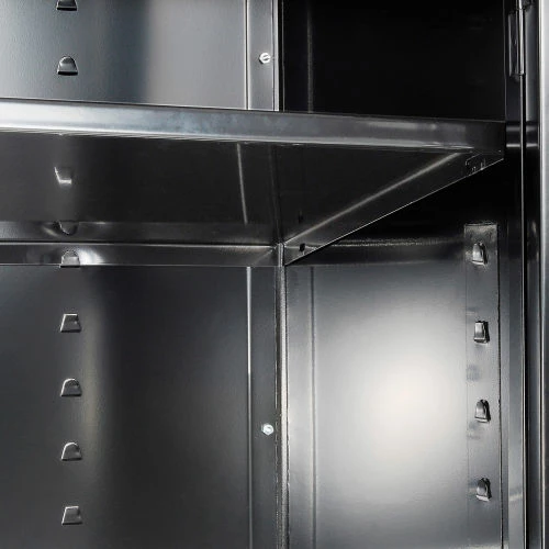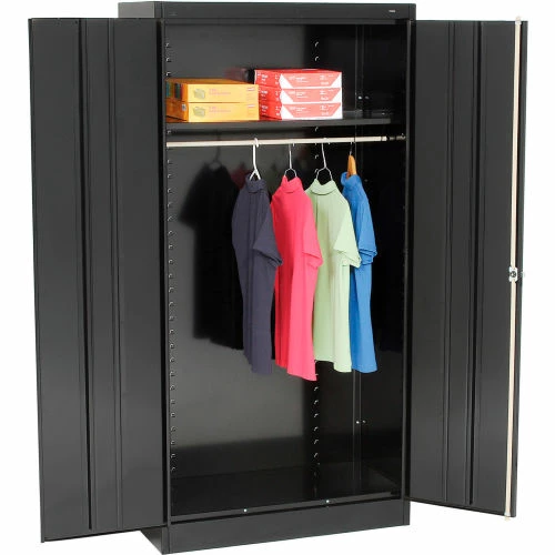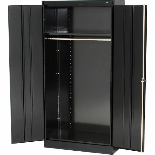Clean, contemporary style and durable construction makes this steel storage cabinet perfect for office or warehouse environments. Made of durable cold rolled steel using 24 gauge steel body reinforced with a 22 gauge steel frame. Reinforced doors include 3-point locking system with die cast chrome plate locking handles for security. Locking flat bar rods include nylon guides for smooth door operation. 22 gauge steel shelves are height adjustable at 2 increments. 150 lb. shelf capacity. Wardrobe Cabinet features one full width fixed shelf and one full width garment rod. Durable powder coat finish. All Tennsco products are Proudly Made in the USA.
